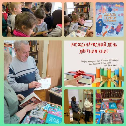 Международный день дарения книг - это праздник, который призван прививать любовь к чтению книг. Этот день объединяет тех, кто дарит свои книги и тех, кто принимает их в дар. Учащиеся школы совместно с читателями библиотеки №3 приняли участие в акции «Подари книгу». Участники акции доказали, что книги остаются ценным подарком особенно в наш век высоких электронных технологий. Очень надеемся, что такой «книговорот» будет постоянным и интерес к чтению, любовь к книге поселится в семьях наших читателей.